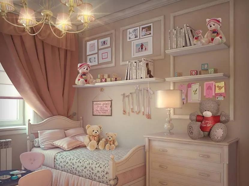 Девочки любят разные оттенки розового, персикового, лавандового, золотистого. Для них допустимо дополнить комнату красивыми кружевами, завесить окна полупрозрачными воздушными занавесками.