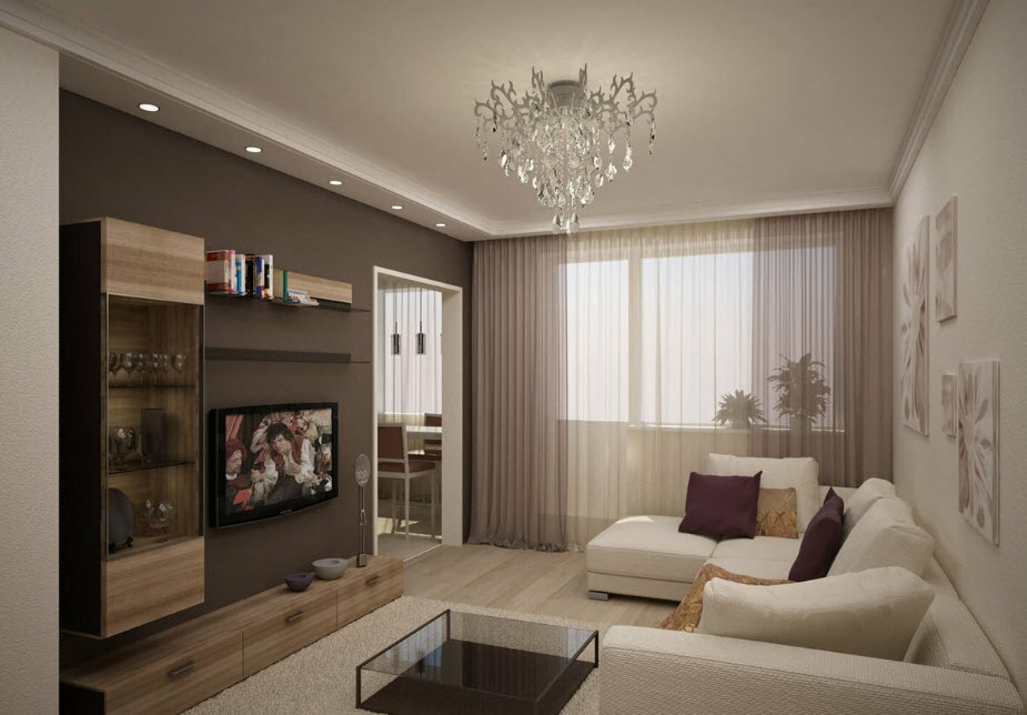Маленькие гостиные – яркая центральная люстра с закрытыми плафонами, направленными в разные стороны. В качестве дополнительного источника света можно использовать настольную лампу или торшер у дивана.