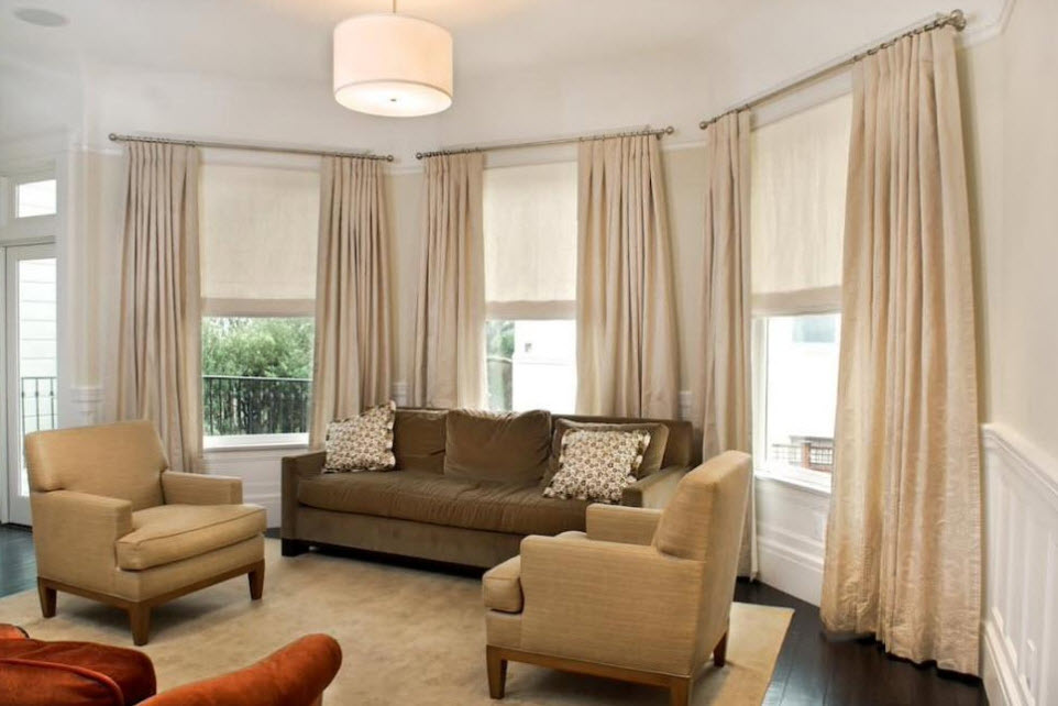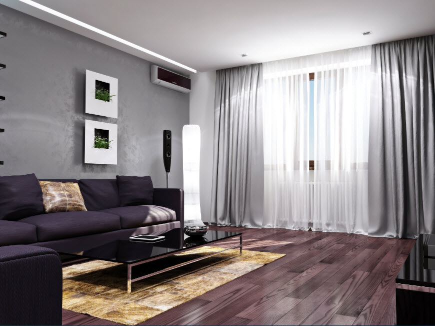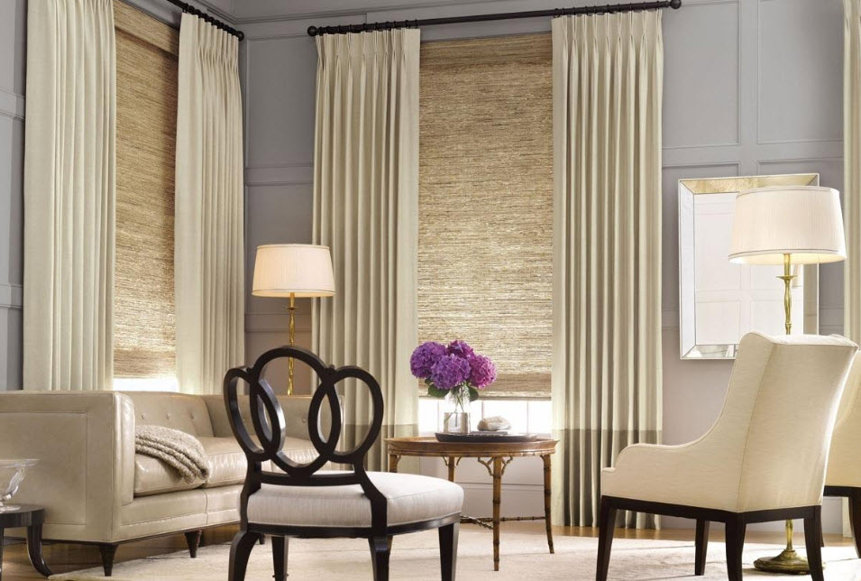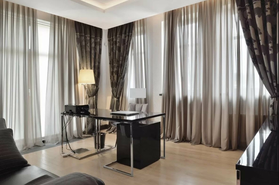 - Текстиль и шторы – обычно в светлых тонах без выраженного узора, строгие прямые шторы, которые часто подбираются под цвет стен. Также для оформления окна можно использовать рулонные шторы и жалюзи. Часто используются шторы блекаут, что удобно при просмотре фильмов на большом экране. Текстильное оформление должно гармонировать с главными цветами интерьера и быть выполненным из натуральных тканей, например, льна или хлопка.