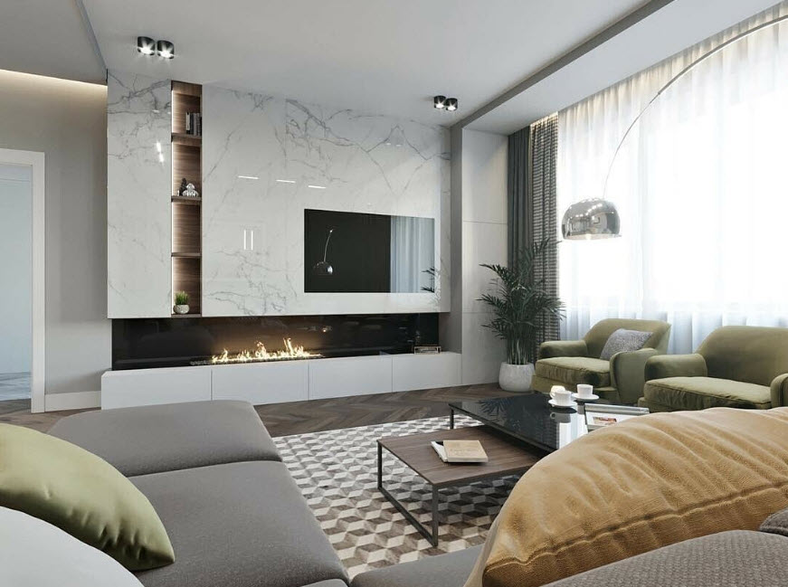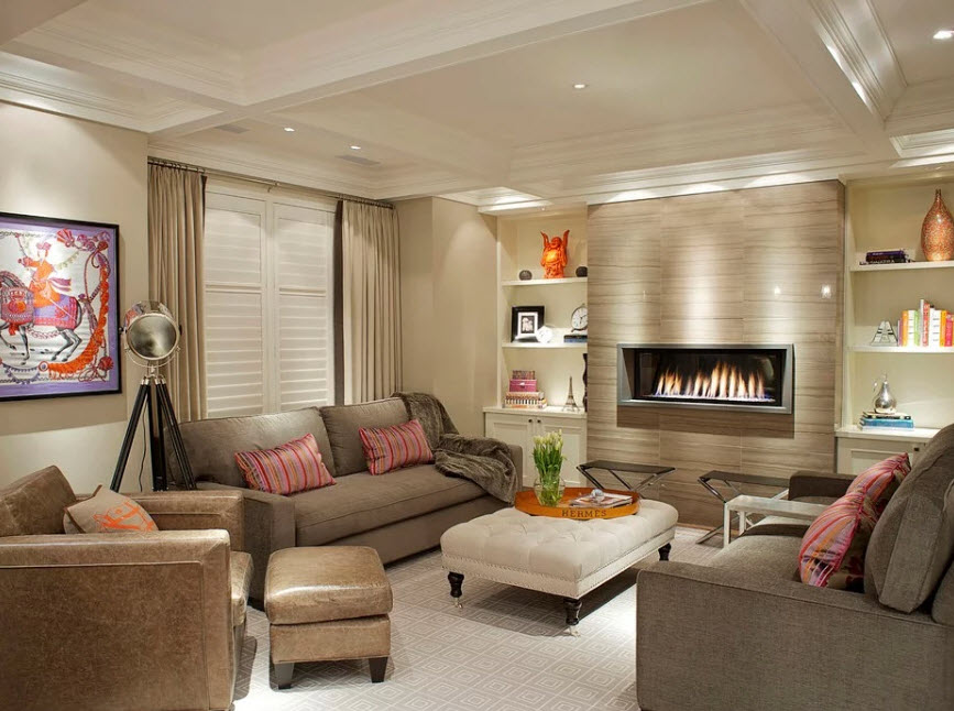 Часто в даже в интерьере современных гостиных комнат устанавливают камин. Для зала в контемпорари стиле лучше всего подходят встроенные камины с минималистичным дизайном
