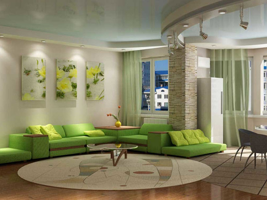 Светло-зеленый оттенок выражает жизнь, энергию и натуральность. В интерьере, этот цвет освежает мысли и настраивает на душевность. В гостиной, зеленые тона могут использоваться в предметах интерьера, отделке, мебели или светло-зеленых, уютных пледах.