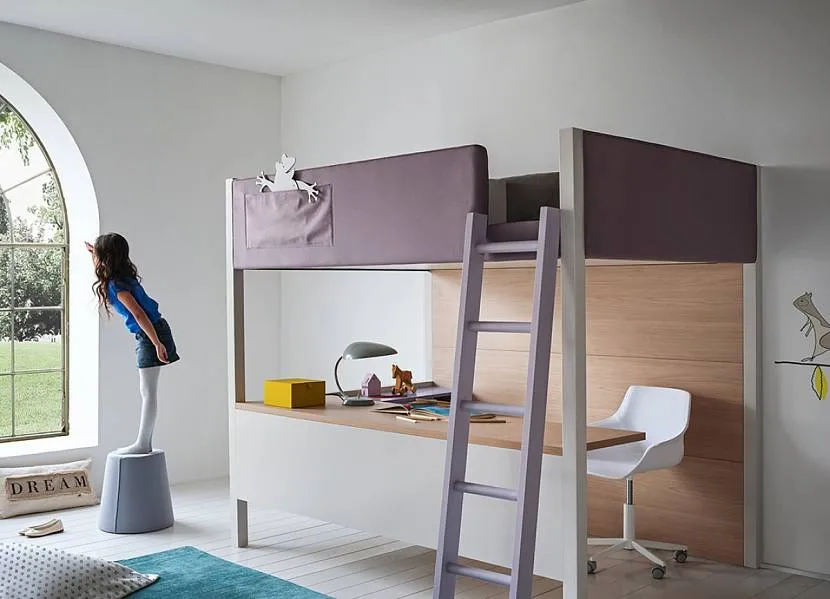 Решением часто оказываются двухъярусные конструкции с обязательным ограждением для большей безопасности. Сверху обычно находится место для сна, а сразу под ним располагается гардеробная со всеми полагающимися атрибутами – небольшими шкафами, зеркалом, крючками.