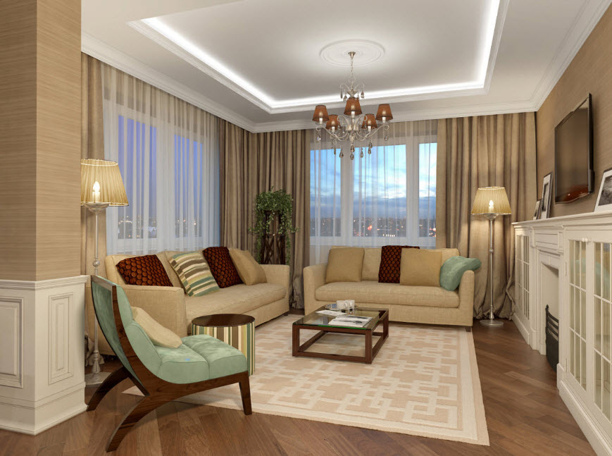 В такой гостиной можно обустроить два полноценных источника света, разделив пространство на функциональные зоны.