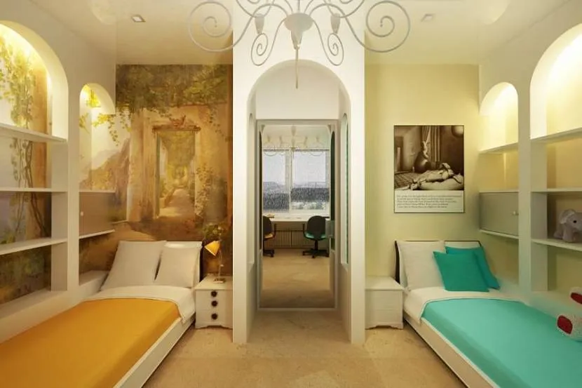 Двухцветные стены детской выглядят очень красиво. Например, сочетание светло-желтого с голубым. Эти оттенки не должны стать монотонными, их разбавляют вкраплениями других оттенков этого же цвета, что придает интерьеру особую живописность.