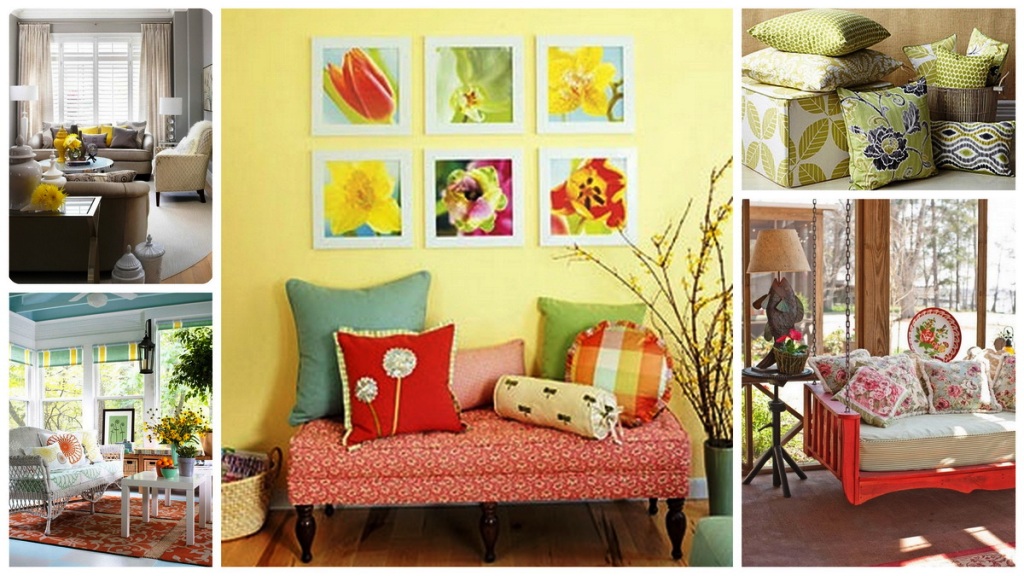 В интерьере очень важен декор. Для наполнения комнаты весенними красками, не обязательно приобретать новую обстановку. Достаточно укрыть мягкую мебель яркими чехлами и в тон им заменить абажуры на светильниках – люстре, торшере, бра или настольной лампе. Выставить живые цветы в прозрачных вазах. Заменить кашпо для горшков с комнатными растениями. Или нанести цветочный орнамент на стены.