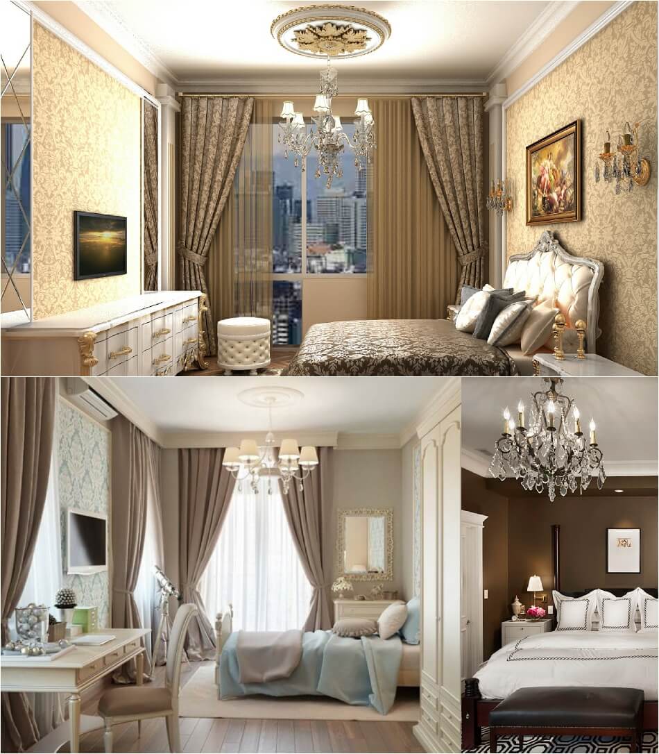 - Люстра в центре спальни – обязательная деталь интерьера, плафоны которой могут имитировать подсвечники.