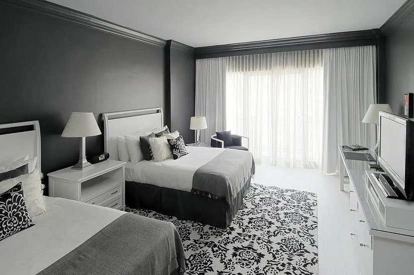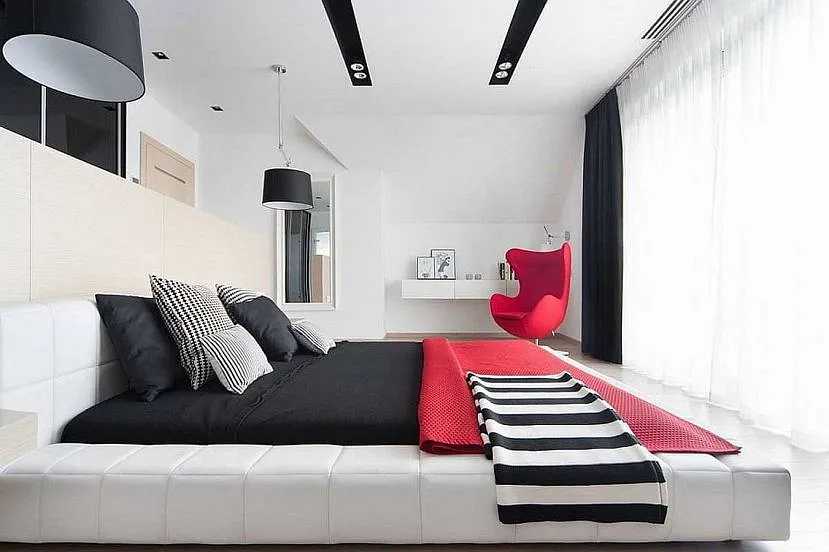 Темные оттенки оптически уменьшают площадь, светлые – увеличивают. В дизайне черно-белой спальни выбирают доминирующий цвет, иначе комната выглядит ненатуральной. Оптимальные пропорции для большого помещения – 60 на 40%. В крохотной «хрущевке» не рекомендуют использовать более 20% приглушенной палитры.