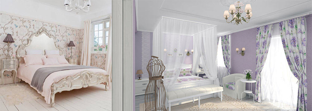 Изящный, романтичный и нежный стиль. Все элементы выполняются с пастельных тонах. Мебель довольно строгая, простой формы. Украшают помещение с помощью большого количества текстиля, это может быть плед с цветочным принтом, шторы в подобной расцветке. Живые и искусственные цветы помогут сделать спальню еще более уютной.
