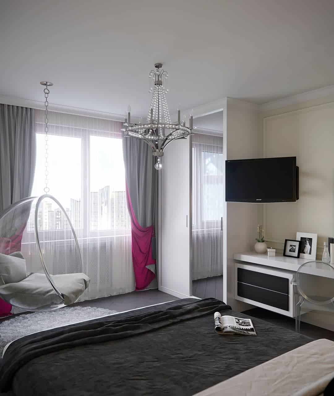 Черными могут быть прикроватные покрывало, постельное белье, шторы на окнах, даже оконные переплеты. Такой интерьер вряд ли можно назвать скучным и монотонным.