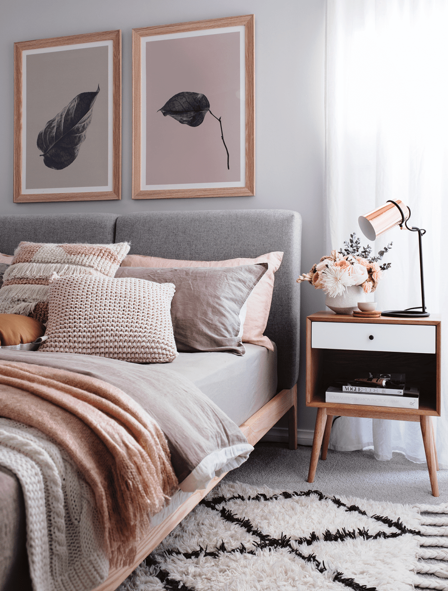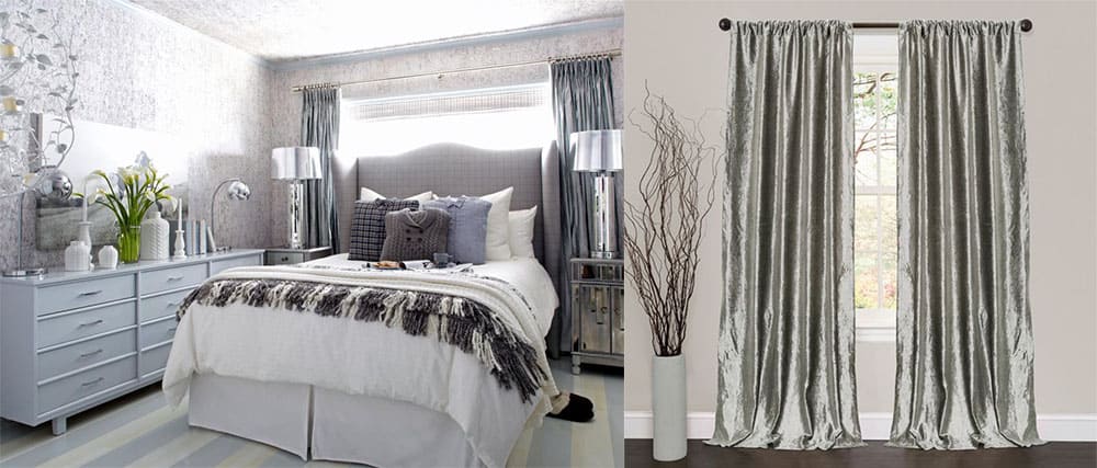 Стены, шторы или жалюзи можно оригинально отделать светло-серыми оттенками. Расставить правильные акценты помогут: изголовье кровати, фотографии, пледы, абажуры осветительных приборов на прикроватном столике.
