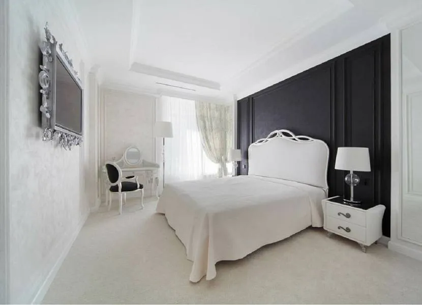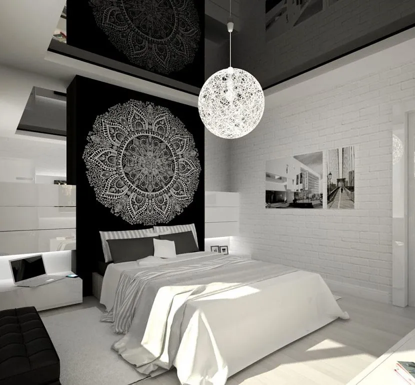 Традиционно потолок выполняют в белом. Для спальни в черном цвете оттенок оптически приподнимает стены, чем увеличивает помещение. Темная глянцевая или матовая поверхность над головой в обрамлении светлого фона смотрится оригинально и смело. Дизайнеры часто комбинируют тон с: