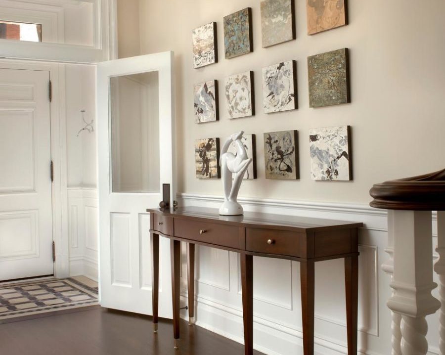 Интерьер прихожей в классическом стиле или ар-деко лучше всего украсит традиционная живопись: акварели, абстракции или репродукции известных полотен – ориентируйтесь на свои личные предпочтения. Позвольте картине солировать в дизайне: пусть она станет единственным ярким акцентом помещения.
