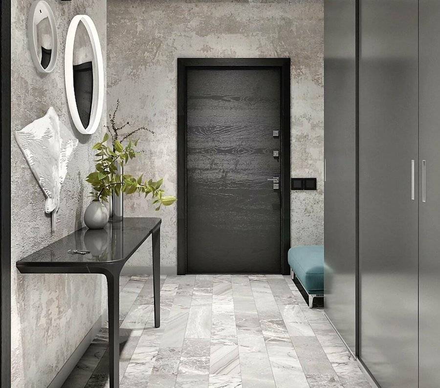 Практичная идея в дизайне прихожей — декоративная штукатурка. Она наносится очень тонким слоем, поэтому не «украдет» сантиметры даже в самом маленьком и узком коридоре. Оштукатуренные стены красятся в любой цвет акриловой водоэмульсионной краской.