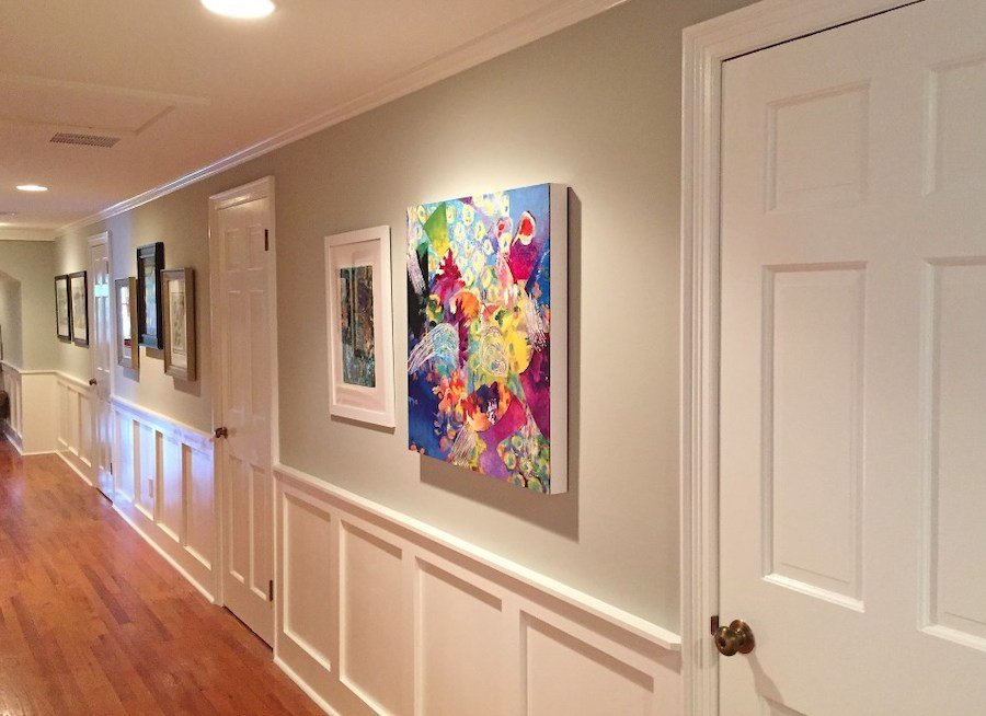 Превратите часть коридора в картинную галерею или фотовыставку. Отделите эту зону от прихожей цветом или фактурой.