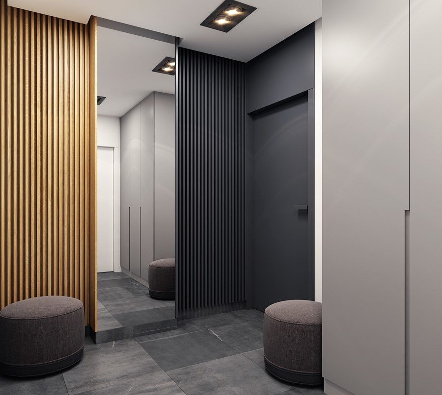 Деревянные рейки в прихожей в стиле минимализм. фактурная штукатурка – для минимализма, современного стиля и лофта;