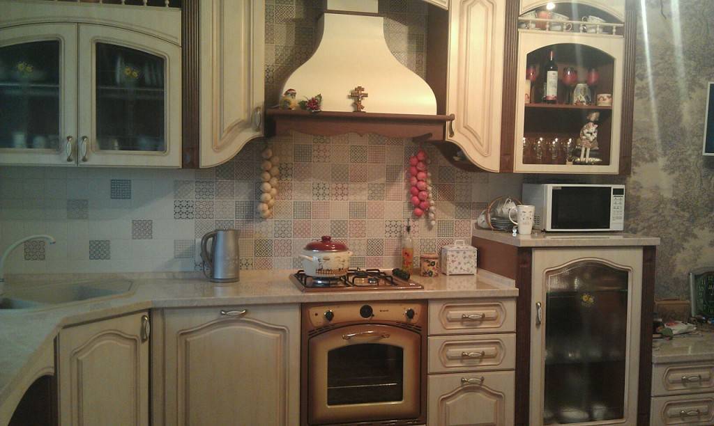 Удачным акцентом оформления может стать одна стена кухни с плиткой пэчворк. Этот прием подойдет идеально, если интерьер комнаты получается слишком лаконичным, безликим. Кроме того, при грамотном подборе оттенков такое оформление поможет визуально корректировать комнату. В качестве ориентира можно использовать дизайнерские фото кухонь в пэчворк стиле.