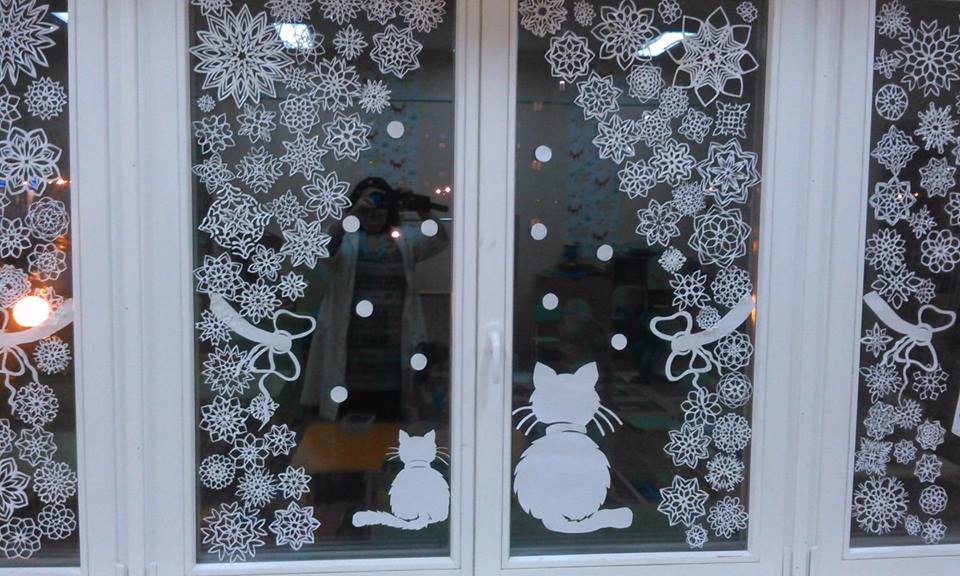 Сегодня очень популярно украшать окна в детском саду искусственным снегом. Конечно, он выглядит эффектно и повторяет текстуру настоящего снега, но у некоторых детей может быть аллергия на химический состав искусственного снега. К тому же подобное украшение с трудом смывается с окон, оставляя многочисленные разводы.