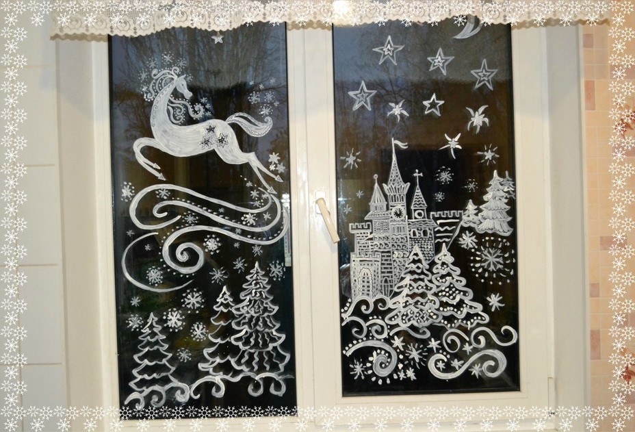 Если вы хорошо рисуете, то украсить окна к Новому году не проблема. Воспользуйтесь гуашью, акварелью или обычной зубной пастой и создайте на окнах витиеватый «морозный» рисунок подобно тому, который появляется на них каждое утро.