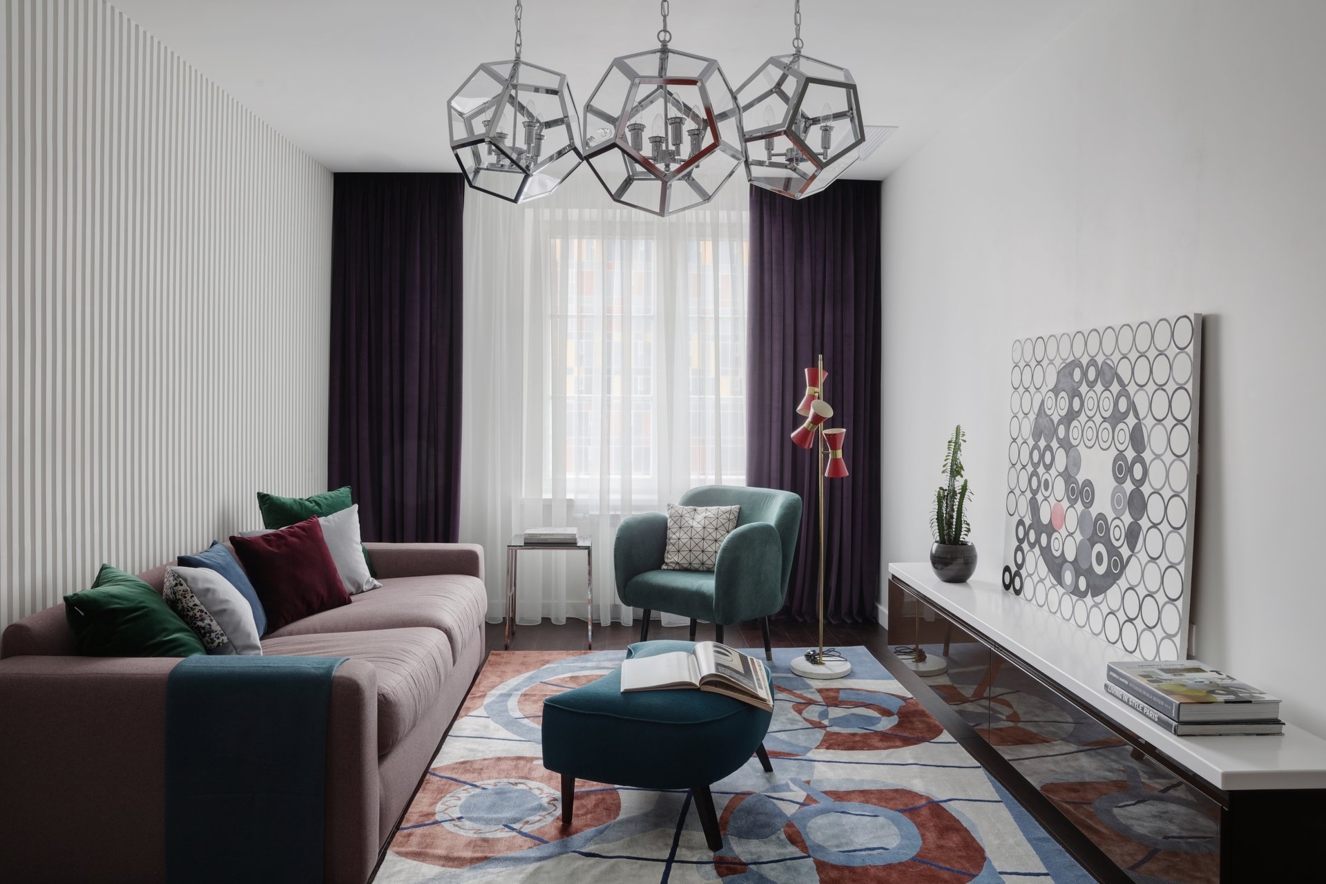 Столь же геометрично выглядит и одна из стен гостиной. Обои на ней имеют рисунок в виде прямых вертикальных линий светло-серого цвета. Картина стене напротив состоит из множества раскрашенных кругов, почти как ковер.