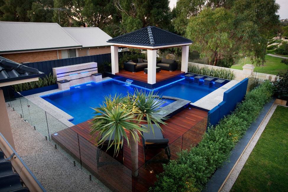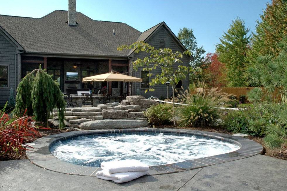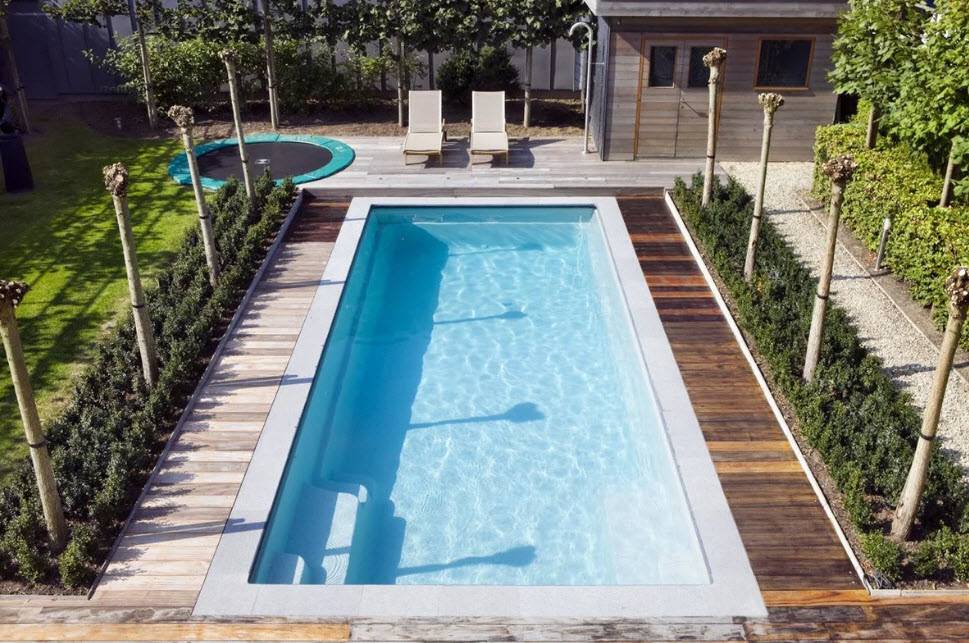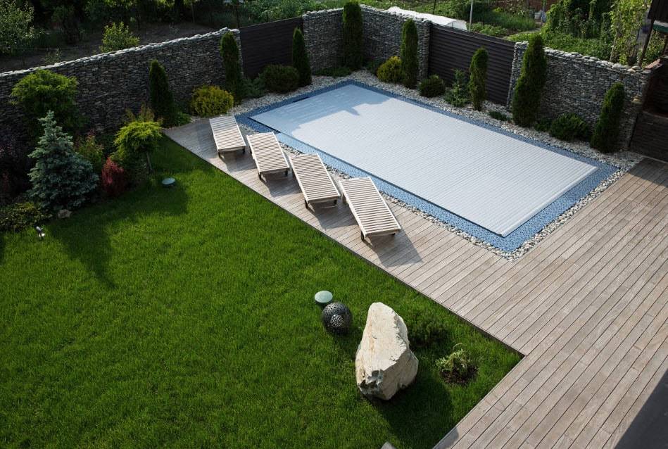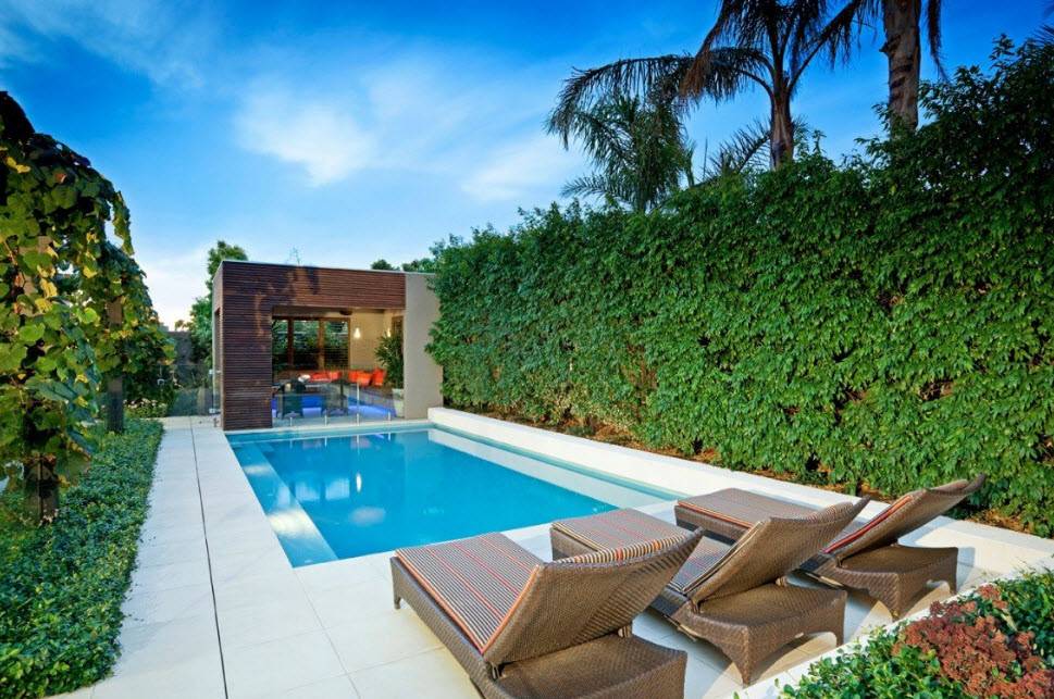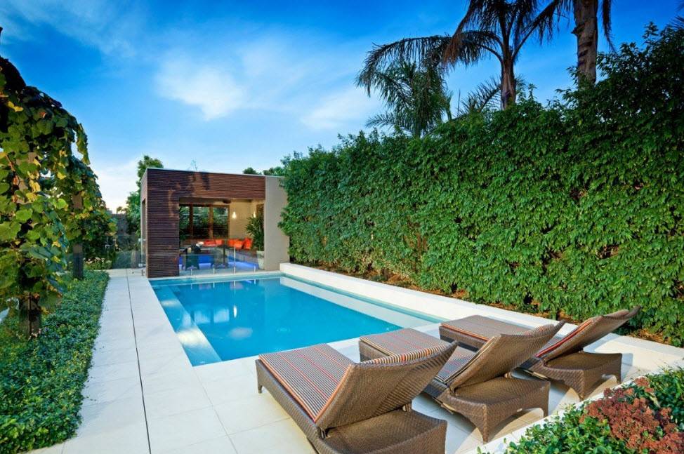 После водных процедур хочется не только с комфортом выбраться из бассейна, отправившись в дом, но и позагорать под солнечными лучами, выпить прохладительный напиток и насладиться окружающий ландшафтом. Воплотить все это в жизнь поможет зона отдыха у бассейна, которая может представлять собой шезлонги с пляжными зонтами, садовую мебель, кресло-качалку или полноценную беседку.