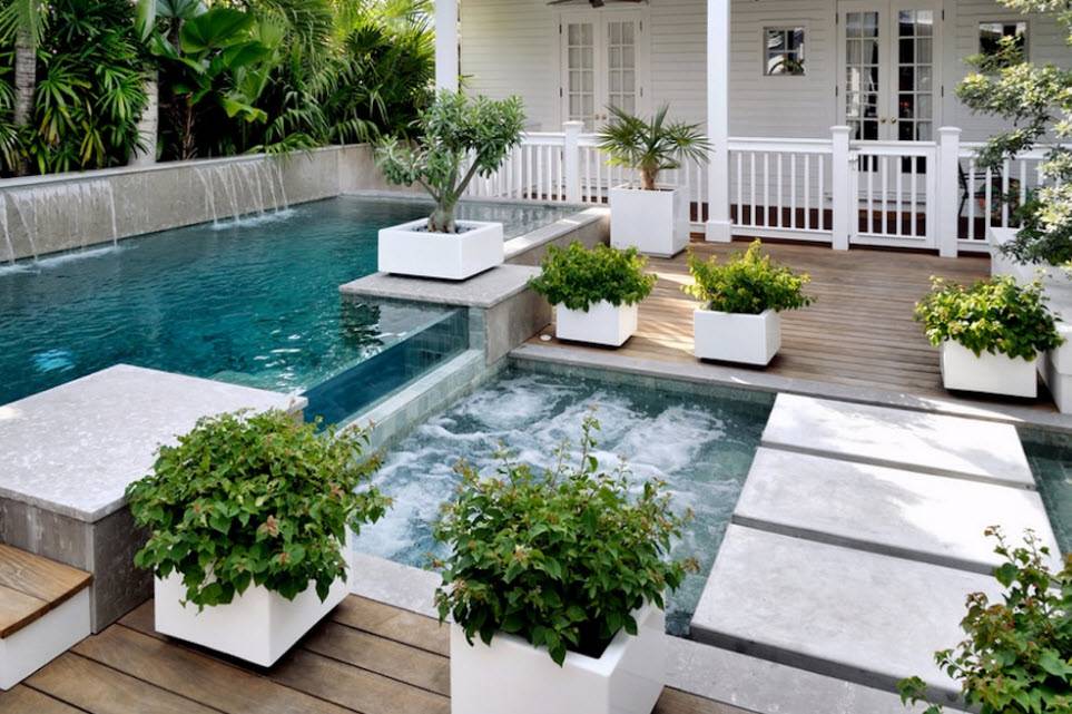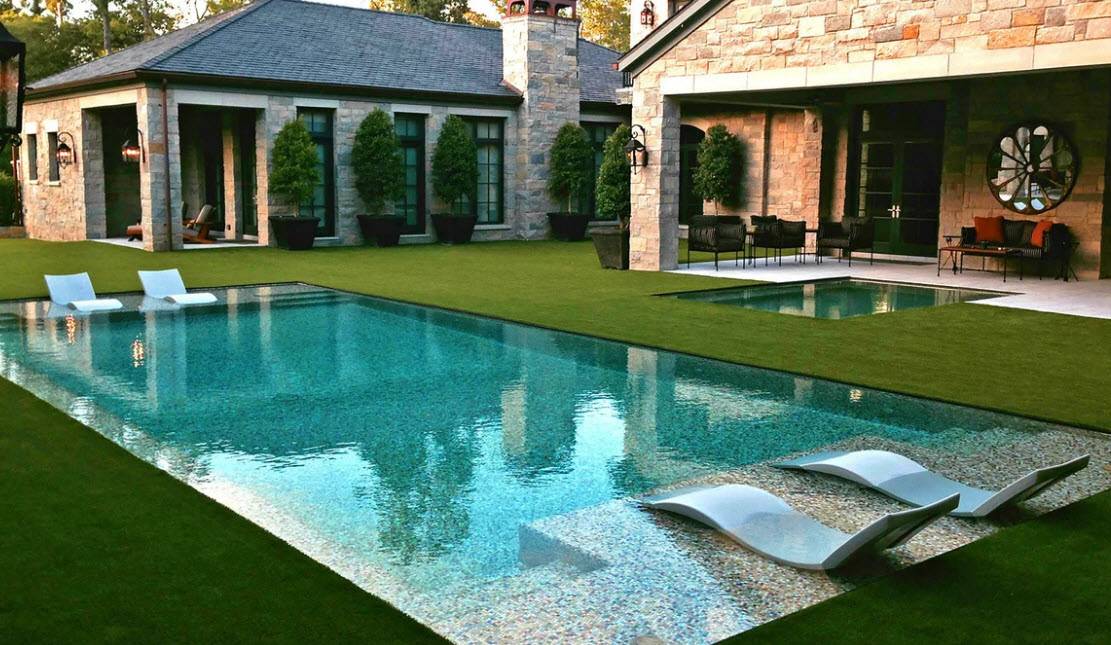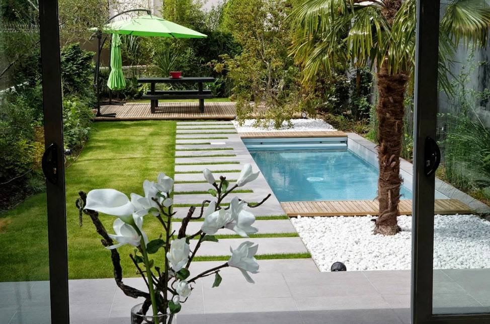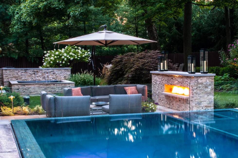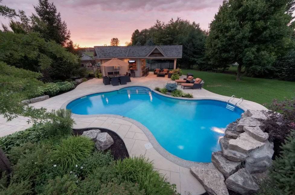 После водных процедур хочется не только с комфортом выбраться из бассейна, отправившись в дом, но и позагорать под солнечными лучами, выпить прохладительный напиток и насладиться окружающий ландшафтом. Воплотить все это в жизнь поможет зона отдыха у бассейна, которая может представлять собой шезлонги с пляжными зонтами, садовую мебель, кресло-качалку или полноценную беседку.