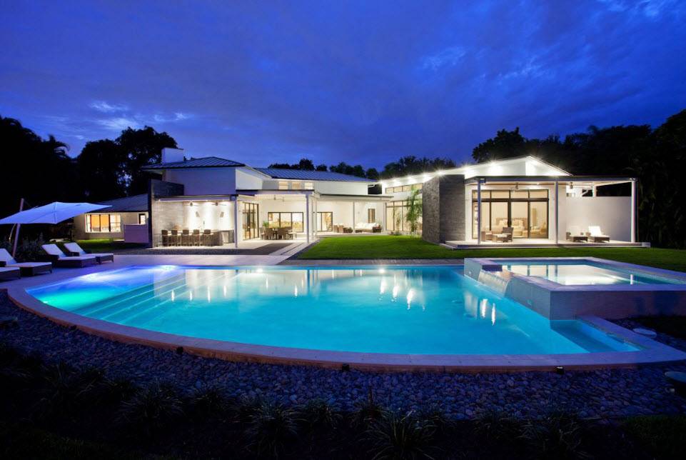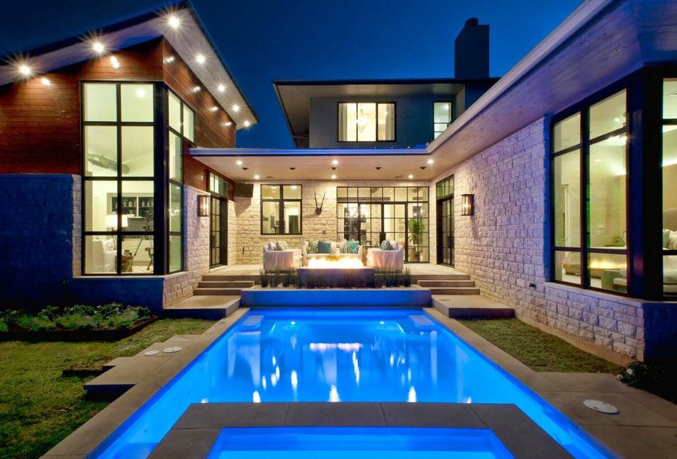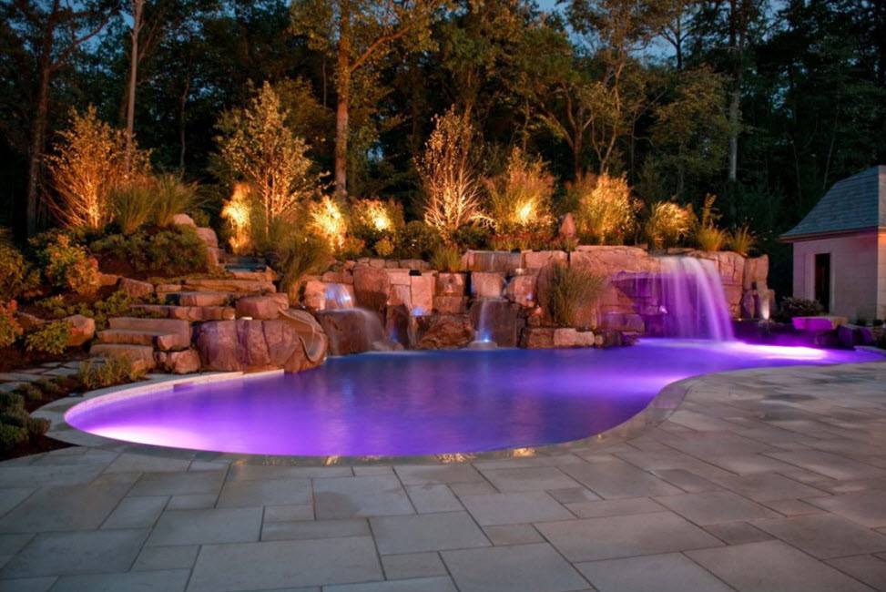 В последнее время популярными становятся светодиодные светильники с повышенной защитой и надежной герметичностью, чтобы избежать контакта с водой. Для создания уникального помещения или ландшафта приусадебного участка можно совместить освещение бассейна и окружающего пространства.