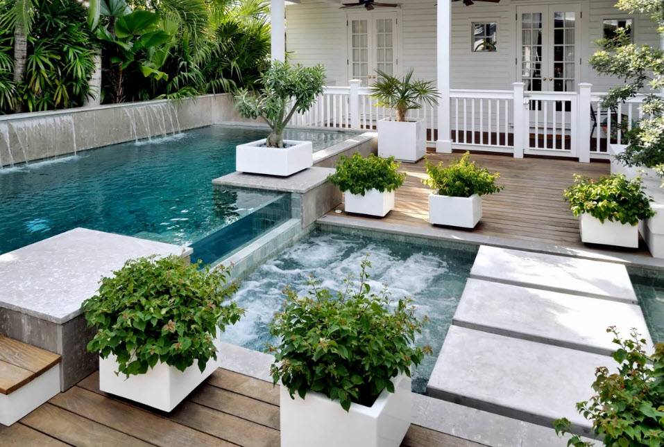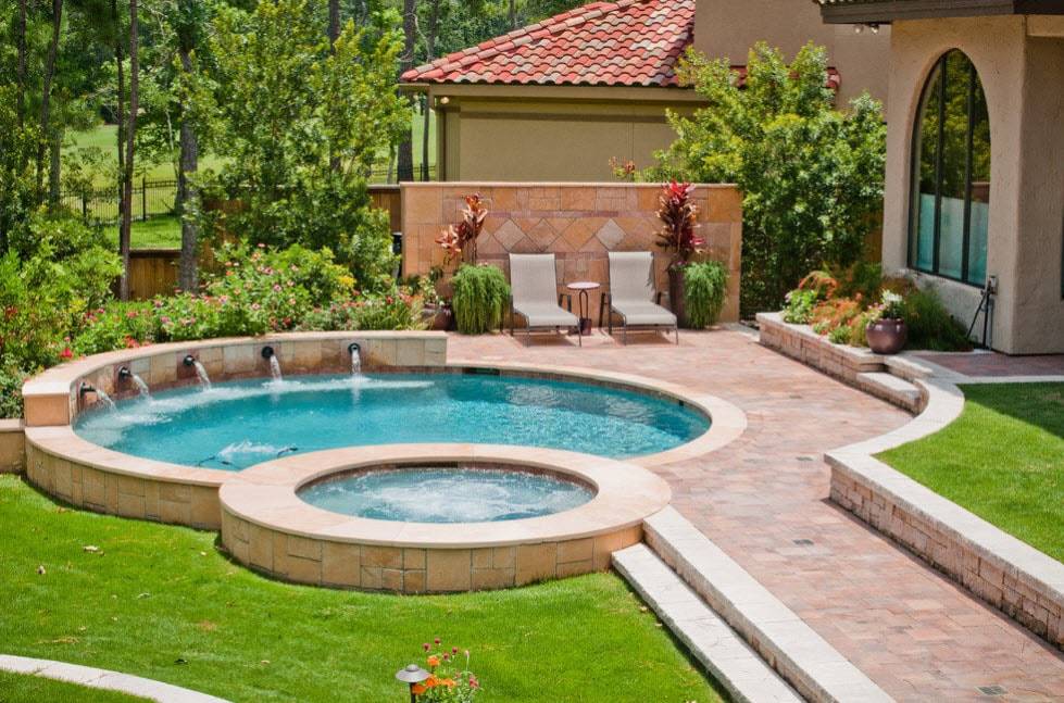 Чаша с двумя отделениями. Первое может быть глубоким и более просторным, в то время как второе станет мелким и небольшим. Комфортный спуск в воду обеспечат красивые ступени;
