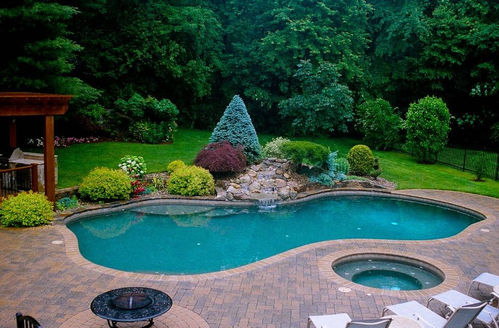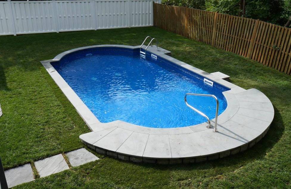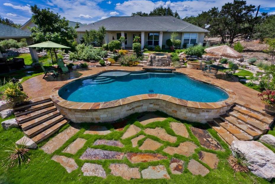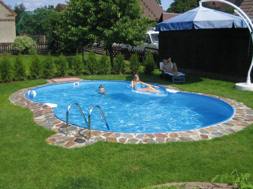 Восьмеркой. Приятный на вид и удобный бассейн на даче. Для погружения предусмотрена удобная металлическая лестница, по сторонам имеется каменное мощение, предотвращающее случайное попадание в воду различного мусора и земли. Кроме этого, камень существенно преображает вид водоема, делая его более привлекательным в глазах окружающих;