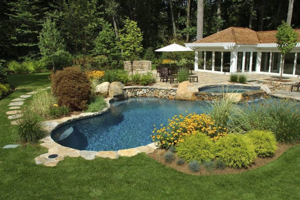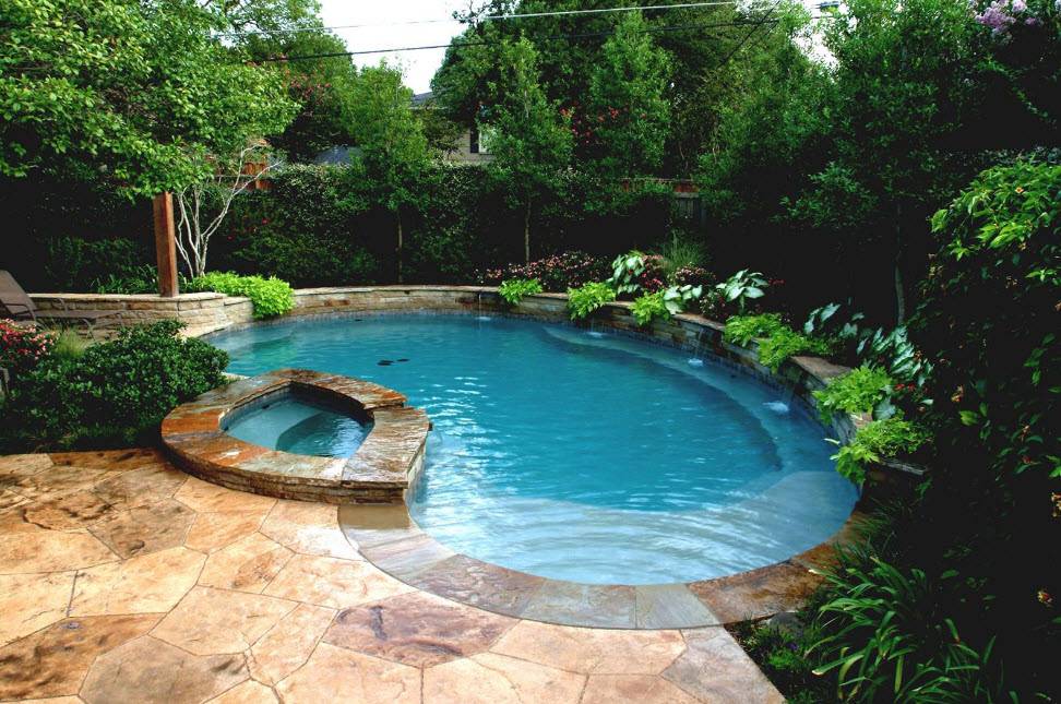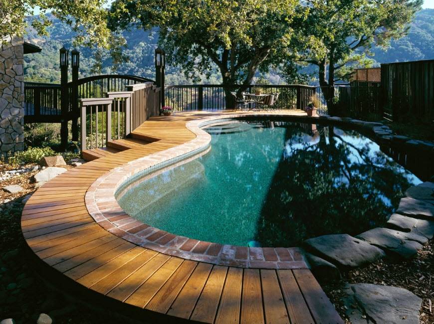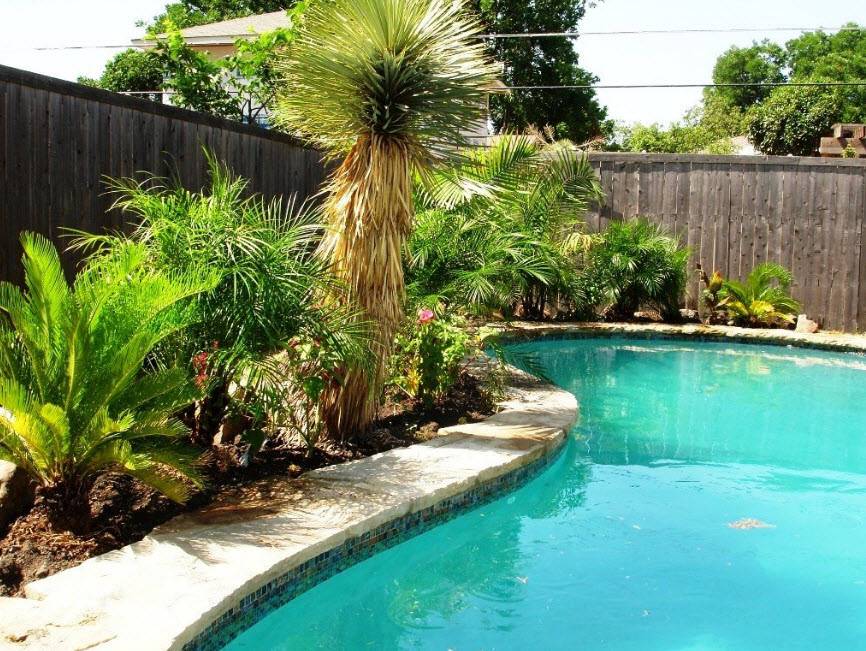 Для оформления береговой зоны используются морозостойкие материалы: дерево, тротуарную плитку или природный камень. Дизайн бассейна на открытом воздухе непременно включает в себя живые растения: деревья, кустарники и цветы, которые лучше размещать не только рядом с водоемом, но и по всему приусадебному участку. Лучше высаживать растения, период цветения которых приходится на разные месяцы. Тогда зона около бассейна будет выглядеть уютной и красивой в течение длительного времени.