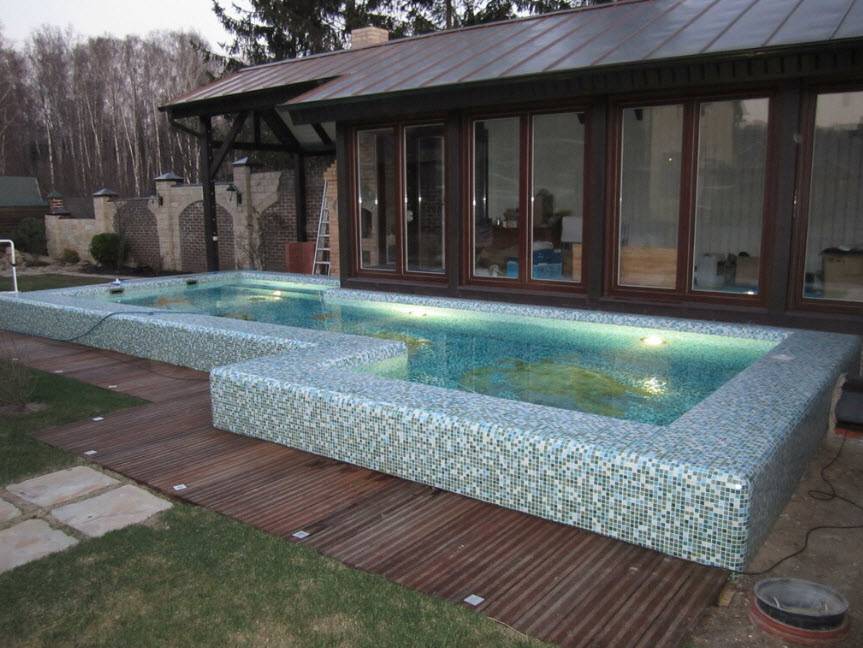 Всегда актуальной остается отделка бассейна и площадки вокруг него мелкой мозаикой.