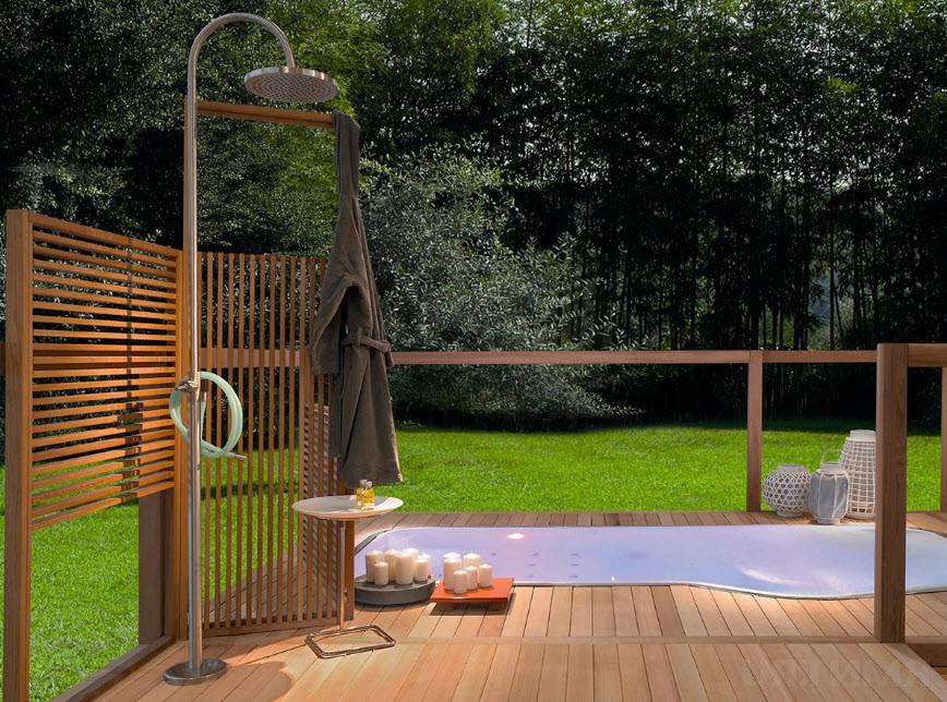 Важно, чтобы душ был спрятан от ветра, ведь сквозняк может спровоцировать простуду. Душ можно окружить ограждениями, ширмами или же растениями, создающими необычную атмосферу