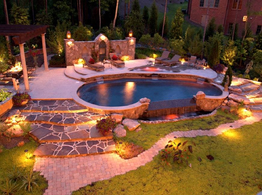 Важно продумать освещение. Все значимые объекты должны быть подсвечены: беседка, крыльцо, фонтан, пруд, дорожки, особенно главная.