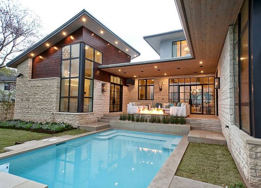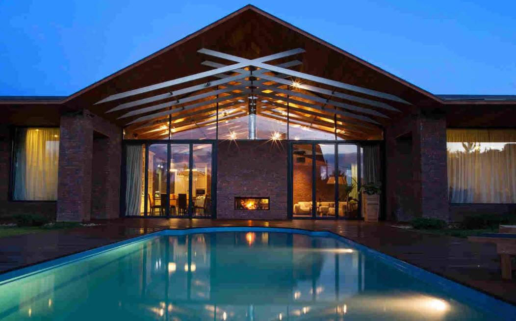 Это комбинирование разных стилей. Стены кирпичные. Потолок обшит вагонкой. Множество окон делают комнату светлой. Бассейн овальной формы, отделан керамогранитом.