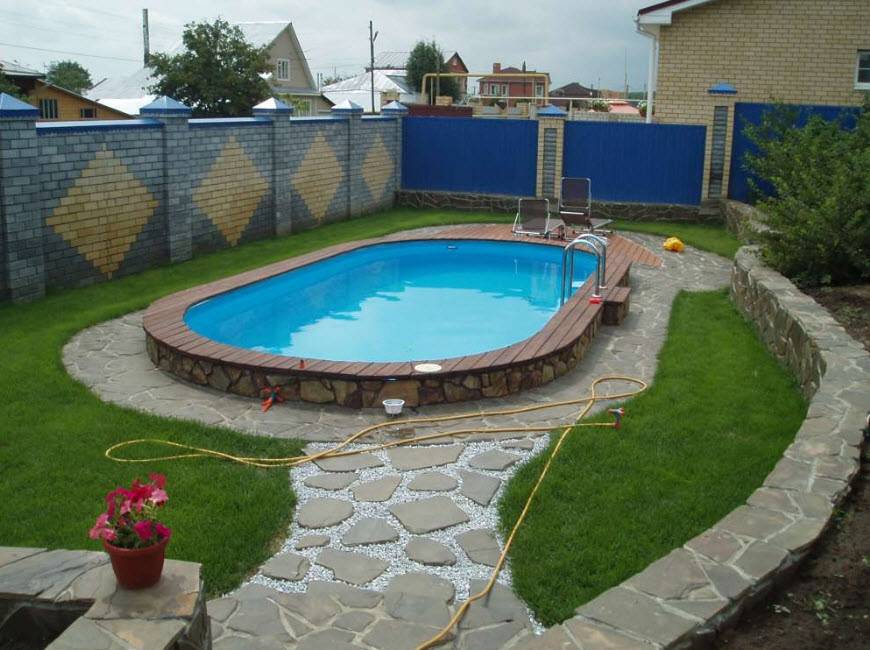 Маленький и круглый. Прекрасный выбор, если у вас в доме есть дети, которые непременно станут много времени проводить на улице в жаркое время года. Чаша дополняется приятной металлической лестницей. Вся конструкция запросто монтируется и разбирается своими руками в течение нескольких часов.