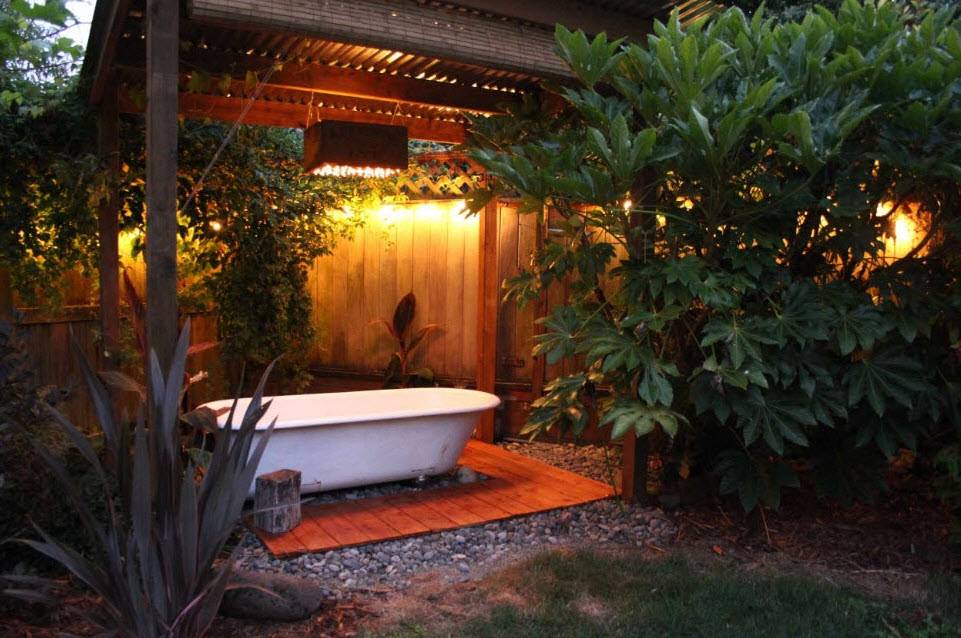 Ванная в саду – оригинальное решение, позволяющее создать романтическую атмосферу. Ванная с горячей водой, травами и лепестками роз – идеальное место для отдыха с прекрасным видом на солнечный закат.