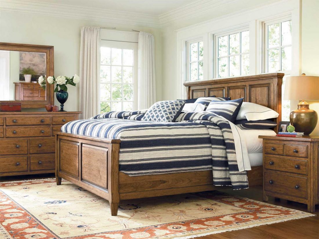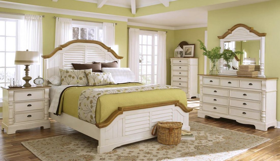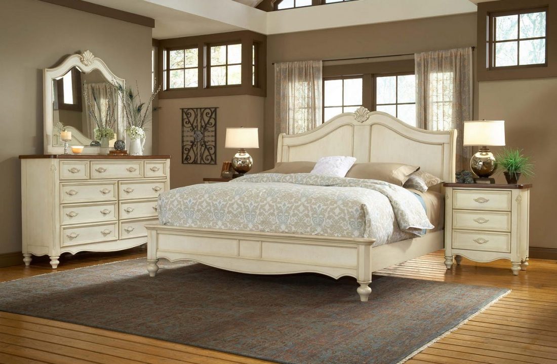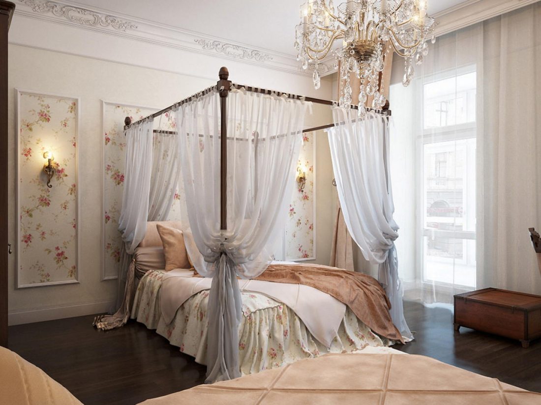 Дополнить кровать необходимо банкеткой в ногах. В том же стиле могут быть выполнены целые комплекты – трюмо, косметический столик, бюро, напольная вешалка-плечики. Такая мебель изготавливается из натурального массива, но может быть окрашена в пастельные или нейтральные тона. Для отделки в этом случае используют медь, бронзу, позолоту.