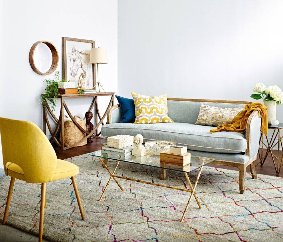 Голубой цвет одинакового хорошо подходит как для стен гостиной, так и для обивки мягкой мебели