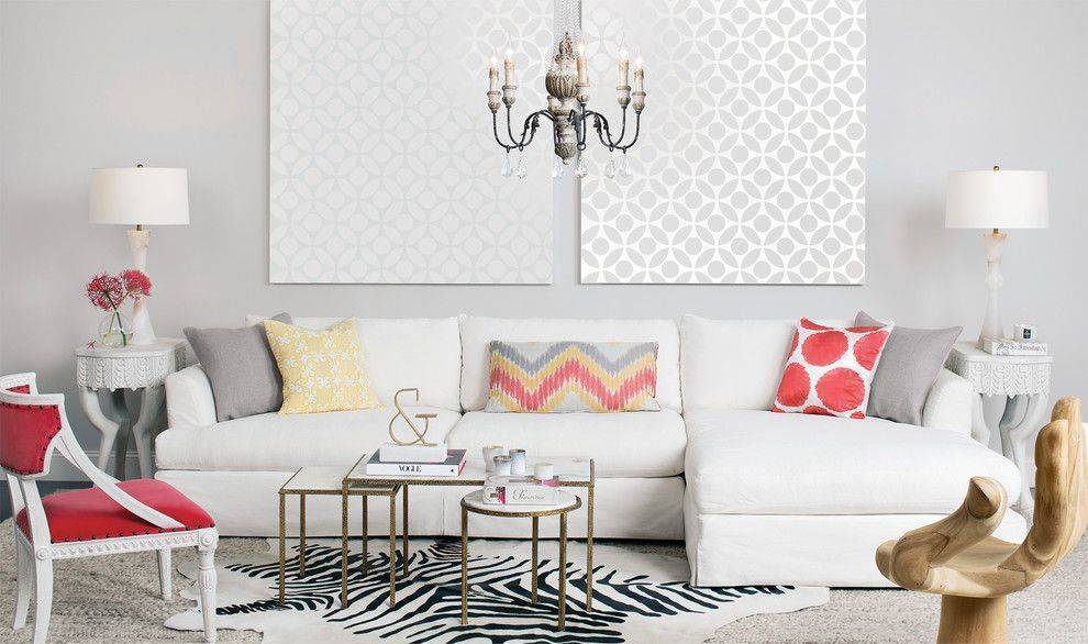 Неуютно будет себя чувствовать в такой комнате массивная и большая люстра. Большое преимущество светильников в том, что располагать их можно любым удобным способом. Благодаря группировке на несколько зон можно добиться ощущения разделенной комнаты
