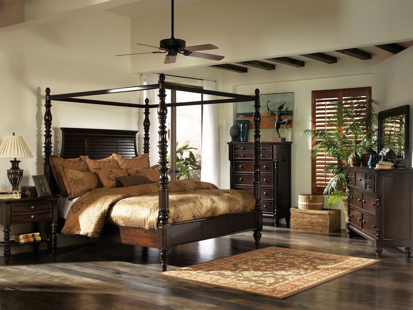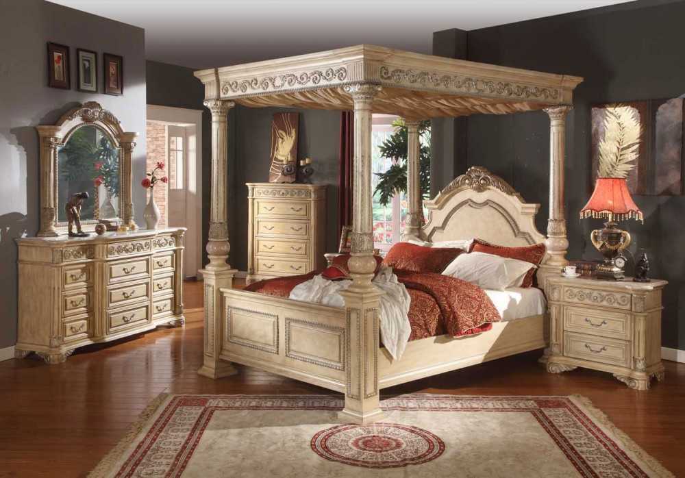 Обустраивая спальню в классическом стиле, подбирайте мебель из древесины преимущественно ценных пород — красного дерева, карельской березы, дуба, вишни. Это всегда массивная, но в то же время изящная, с плавными очертаниями мебель, украшенная резьбой и позолотой. Будет соответствовать классике и белый спальный гарнитур — его преимущество в том, что он подойдет к любой отделке потолка и стен.