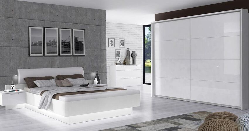 В белой спальне часто расставляют меблировку с глянцевыми фасадами, имеющими привлекательный блеск. Лаковые поверхности не только сделают дизайн красивым, но и за счет светоотражающих свойств визуально увеличат размеры небольшой комнаты.