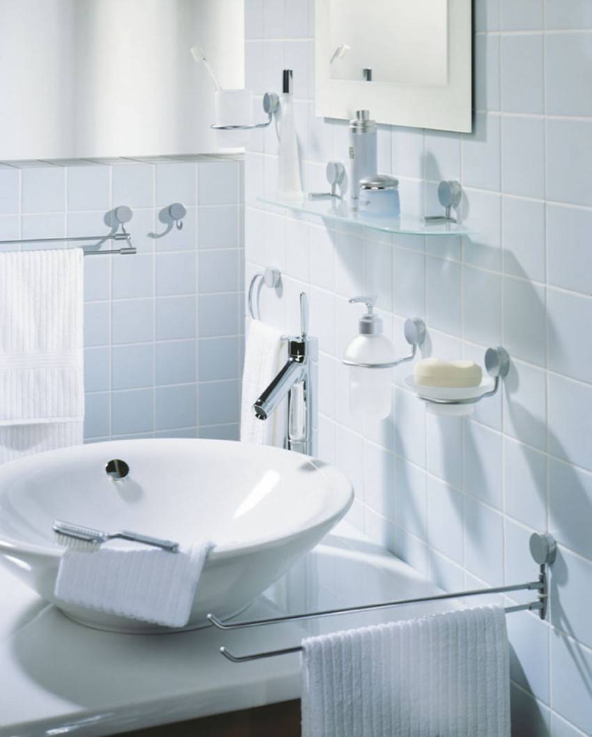 Некоторые предметы крепятся к стенам, остальные – устанавливаются на пол, располагаются на раковине и столешнице.