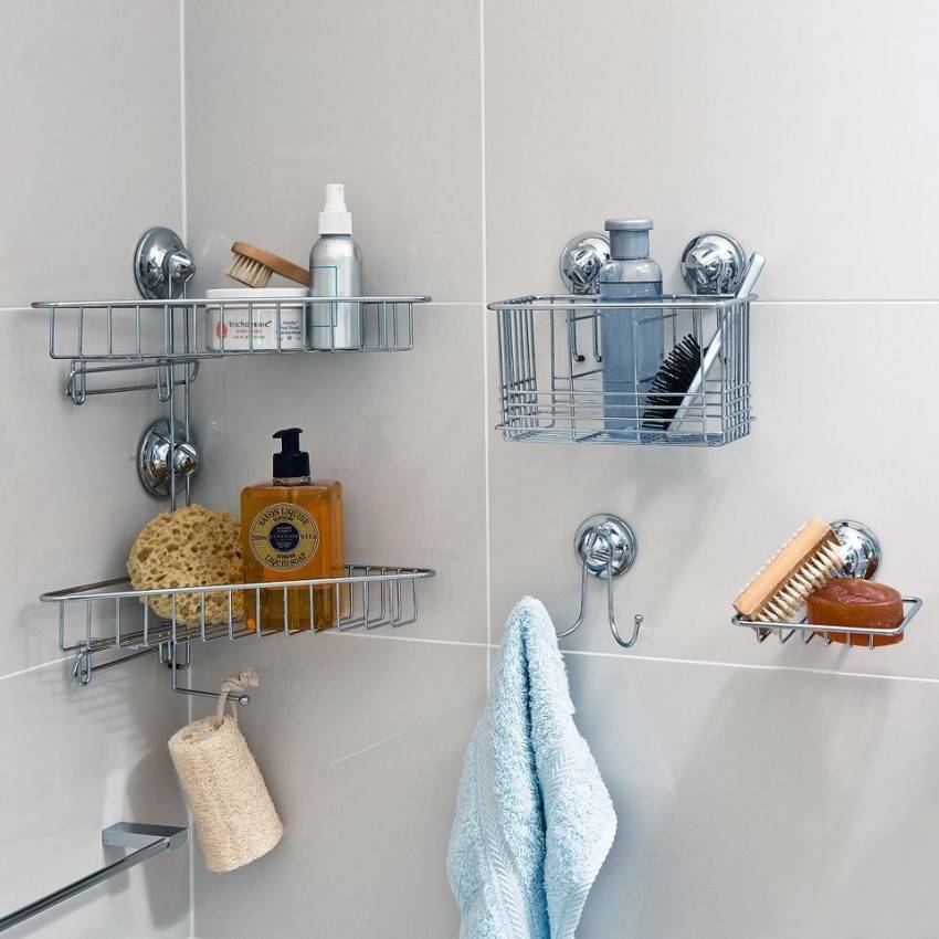 Вместительные угловые полки, повешенные над ванной, – отличное место для хранения шампуней, мочалок и всей остальной бытовой химии. Полочки для ванной выпускают в самых разнообразных формах: прямоугольные, многоярусные, полукруглые и даже для размещения на краю ванны.