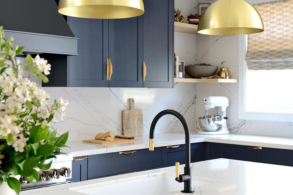 Если вам нравится элегантный классический стиль, выбирайте мрамор. Из него изготавливают различные кухонные принадлежности, настольные и подвесные светильники, столешницы и подоконники. В 2021-2022 году также по-прежнему будут в моде медь и золото.