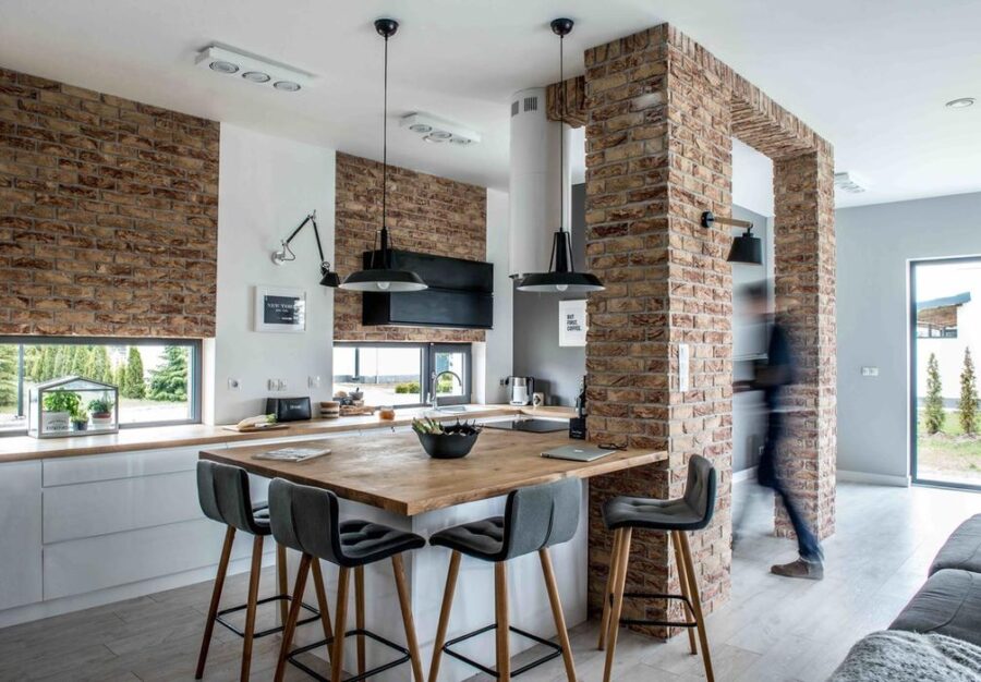 Бывает так, что в частном доме кухня может иметь два входа и выхода, соответственно она будет считаться проходной. В таком случае вашей главной задачей будет чётко отделить рабочую зону, при этом используя мебель с одинаковым фасадом. В такой планировке кухонный стол рекомендуется поставить где-то на границы кухни и коридорного помещения.
