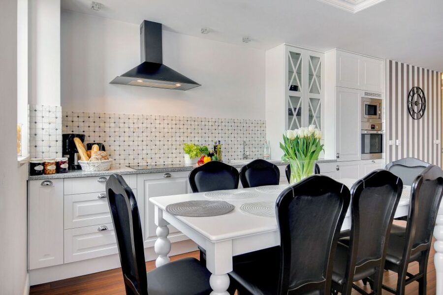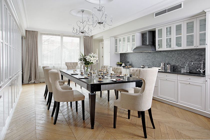 В-третьих, заранее подумайте о расположении будущей обеденной зоны. Правильно подобранные габариты стола должны обеспечить свободное и безопасное перемещение в пространстве, не создавая неудобств.