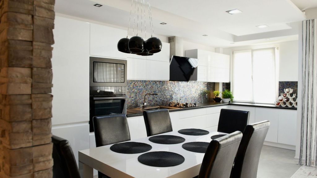 Традиционная бело-черная гамма кухонного помещения остается в моде всегда. Светлые столы сочетаются с темными гарнитурами и наоборот. Белыешкафы на кухне отлично смотрятся рядом с черными столешницами.