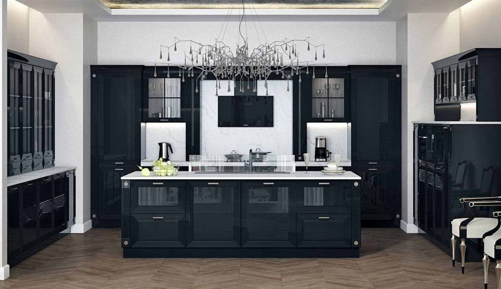 Черно фасады — решение вне времени. Такая мебель эффектно смотрится в любом интерьере и в любом стиле, от минимализма до современного. При изменении соотношений этих двух цветов можно получить совершенно разные кухни. С увеличением числа белых элементов комната становится более просторной и светлой, а с нарастанием темной части фасада — более строгой и солидной. Даже сочетание белого и черного в равных пропорциях позволяет разработать оригинальную кухню, и в том числе создать желаемое зонирование пространства.
