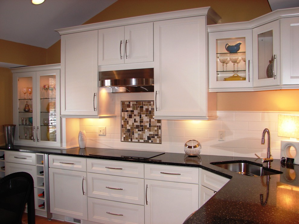 Контрастная светлая кухня с черной столешницей и угловой тумбой под мойкой