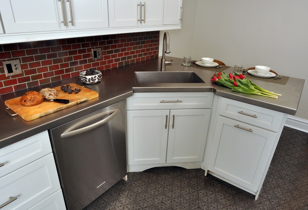 - в углу чаще всего устанавливаются врезные мойки. Они могут быть выполнены из искусственного камня или нержавеющей стали.