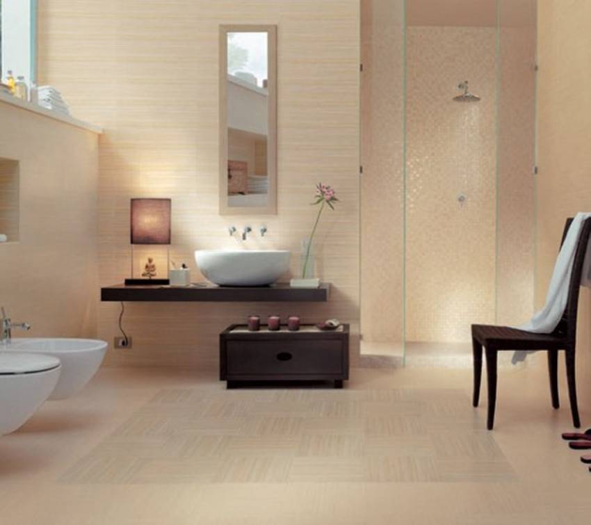 Лучшим выбором для ванной комнаты станет кафель или керамогранит. Преимущество последнего в том, что он не имеет фаски. Поэтому при его укладке не образуются швы, которые так сложно чистить. Стойкость керамогранита к абразивным компонентам – еще один плюс материала. Недостаток – чрезмерная гладкость поверхности. Чтобы обезопасить себя выбирайте плитку с пониженным показателем скольжения – матовую, рельефную.